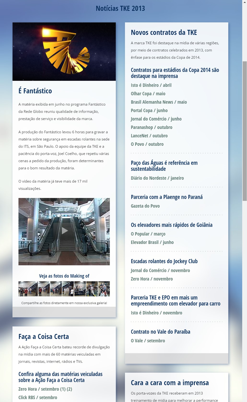 En este informe de prensa anual para la rama brasilera de Thyssenkrupp Elevadores, realizamos en colaboración con Rouxinol Comunicações una presentación anual de clips de prensa en formato Página única (one page) simulando un elevador.